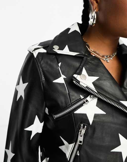 White womens leather jacket with black stars ladies moto jackets Very well made.