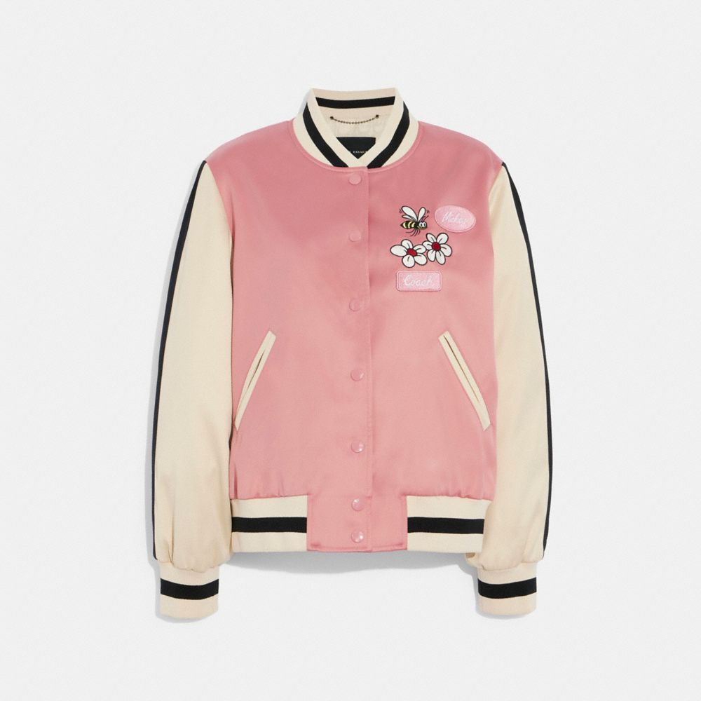 Coach Reversible Tossed Peony Print Souvenir Bomber Jacket Pink Satin F67460 Very well made.