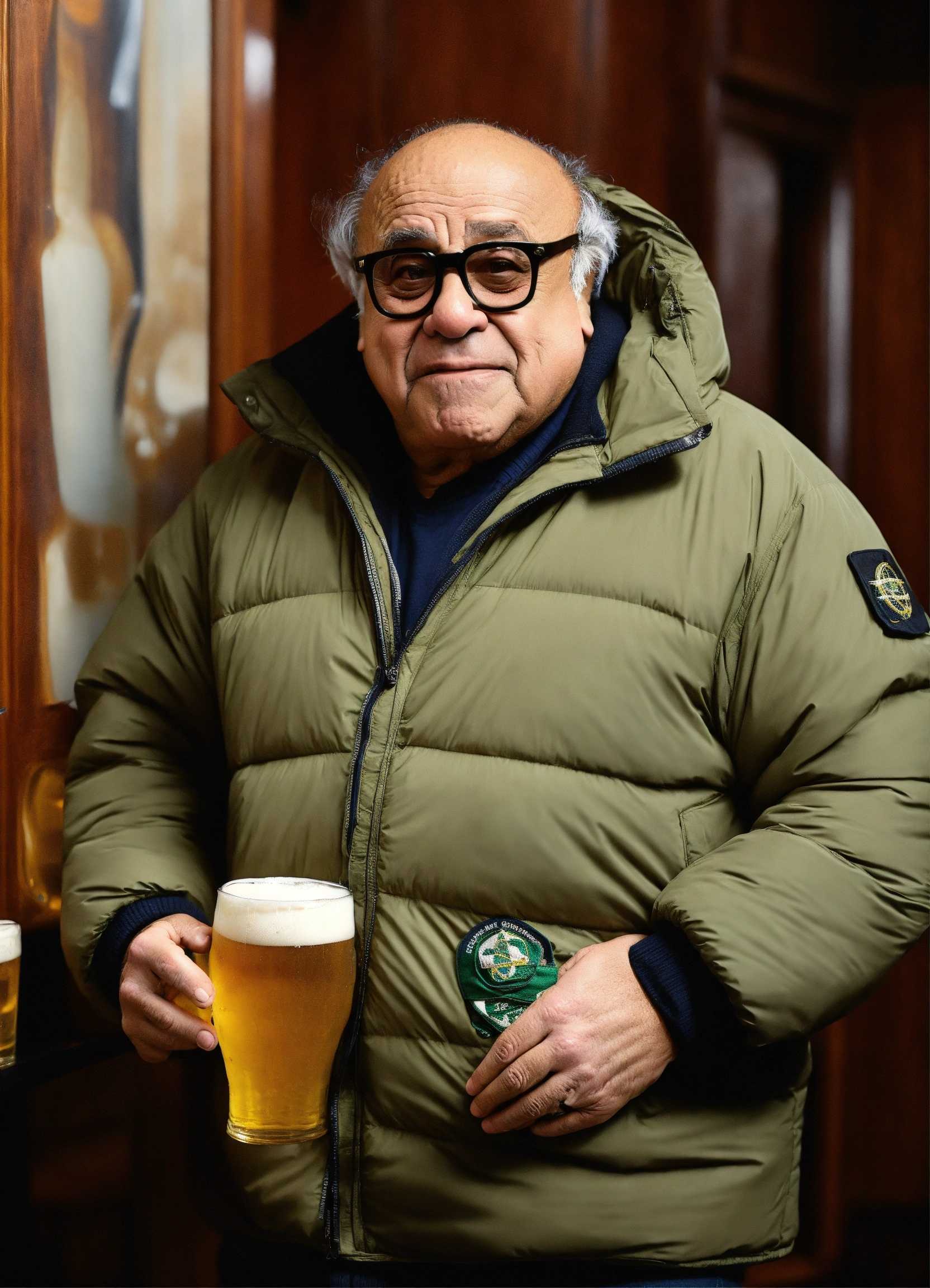 Lexica Danny DeVito wearing a stone island puffer jacket he is drinking a pint of beer in a pub Very well made.