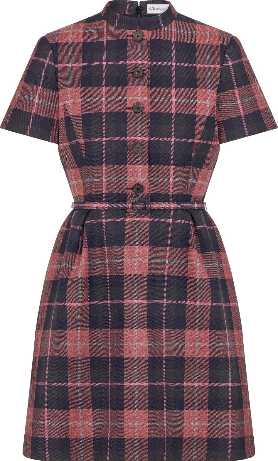 DIOR Belted Short Dress Pink Gray And White Check n dior Virgin Wool Size 36 Women Very well made.