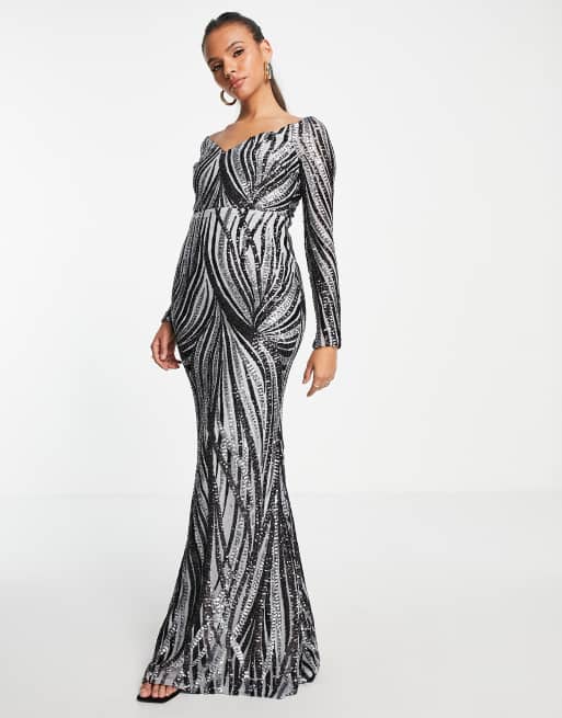 Vestido largo gris y negro bordado de manga larga con escote Bardot de Goddiva ASOS Very well made.