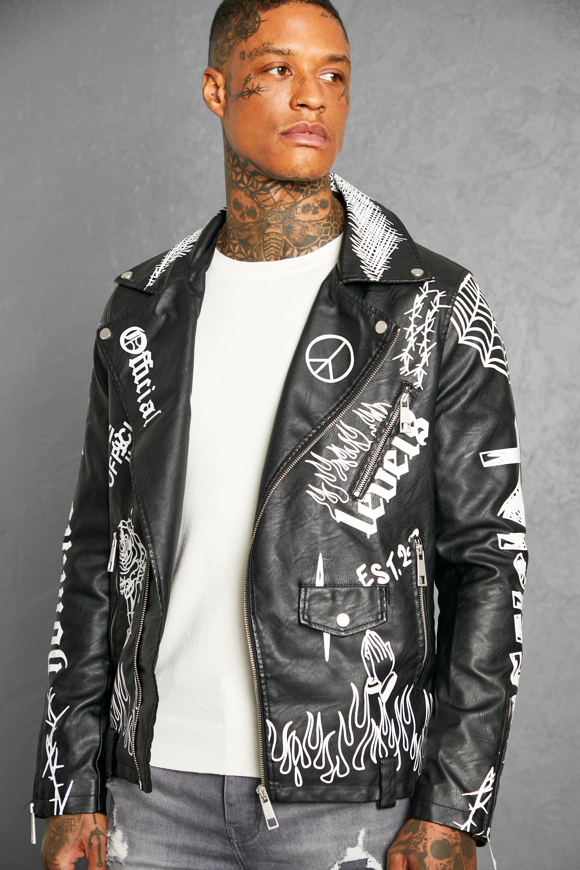 Graffiti Black Leather Jacket Men Faux Leather Moto Jacket Very well made.
