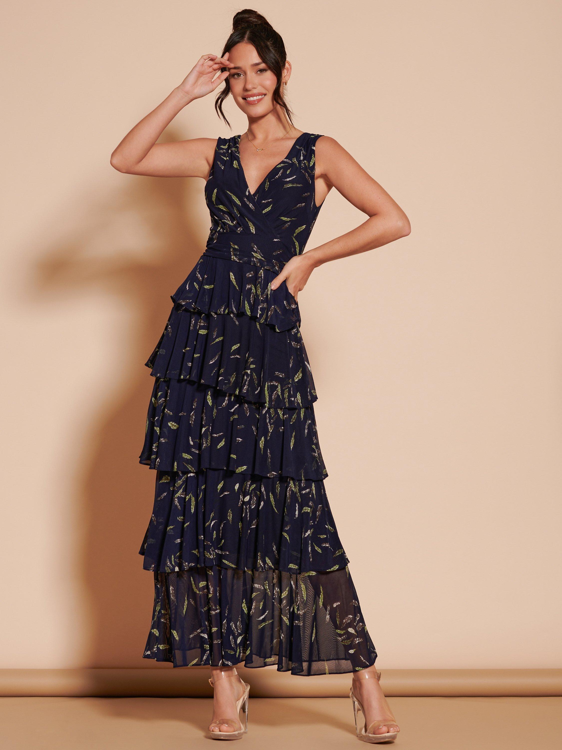 Jolie Moi Tiered Hem Mesh Maxi Dress Navy Multi Very well made.