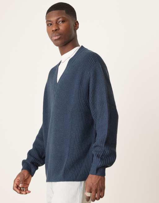 ASOS Design Oversized Knit Fisherman Ribbed V Neck Sweater in Navy Very well made.