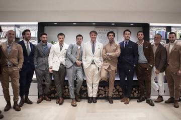 Brunello Cucinelli introduced his new fall collection at Pitti Uomo worn by some members of his team. Tailoring especially double breasted jackets elongated coats with stronger shoulders boucle Very well made.
