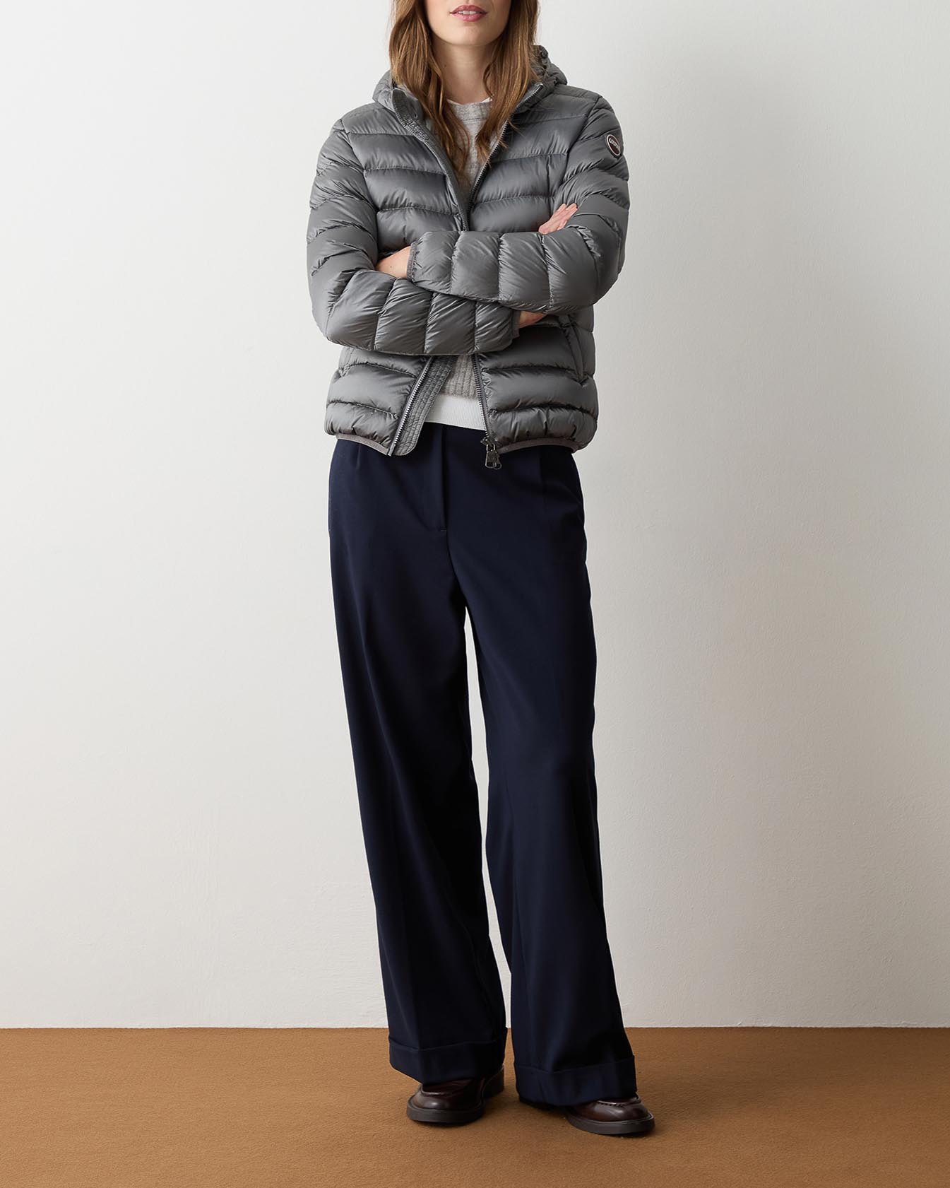 Piumino corto grigio imbottito in piuma naturale in tessuto effetto cangiante con cappuccio e fodera interna Very well made.