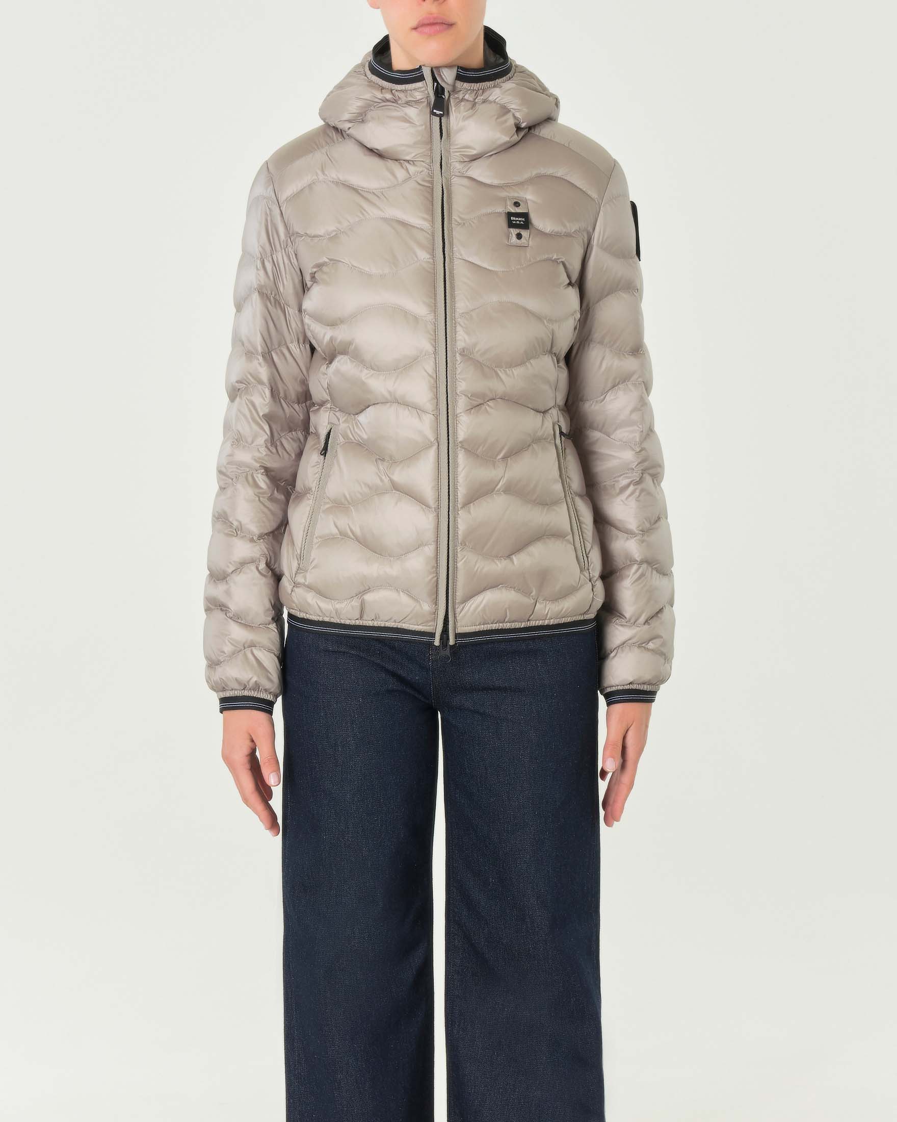 Piumino corto grigio beige modello Camelia con cappuccio fisso e imbottitura in vera piuma con patch Very well made.
