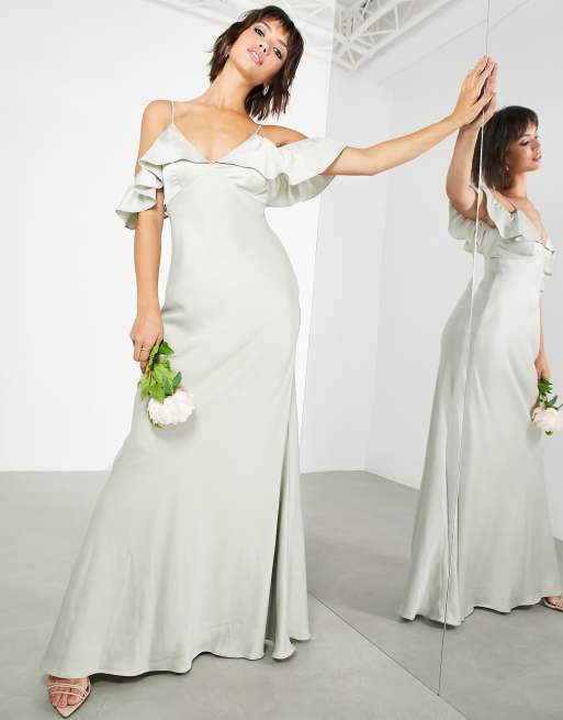 ASOS DESIGN Bridesmaid satin ruffle cold shoulder maxi dress in sage green Very well made.