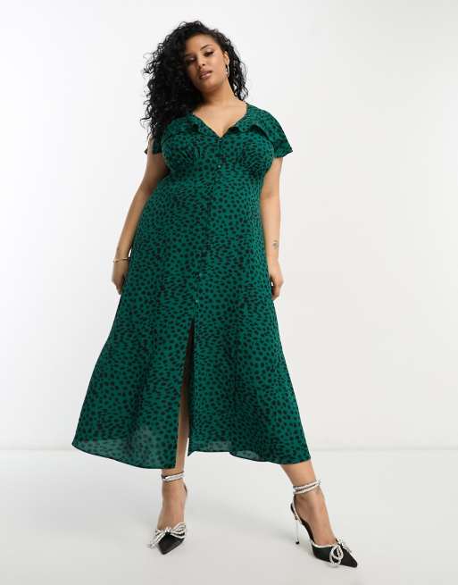 ASOS DESIGN Curve flutter sleeve midi tea dress with button in green animal print Very well made.