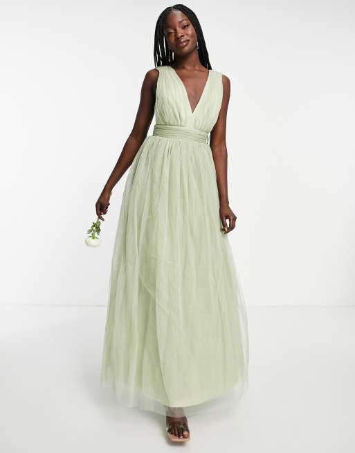 ASOS DESIGN Bridesmaid tulle plunge maxi dress dress with bow back detail in sage ASOS Very well made.