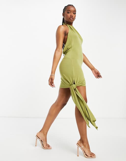 ASOS DESIGN knot halter mini dress in slub in olive Very well made.