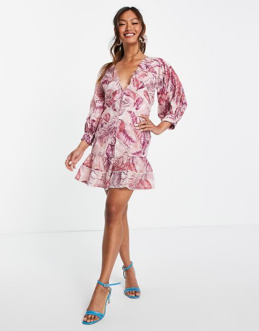 ASOS DESIGN palm print structured mini dress with lace trim detail and puff sleeve ASOS Very well made.